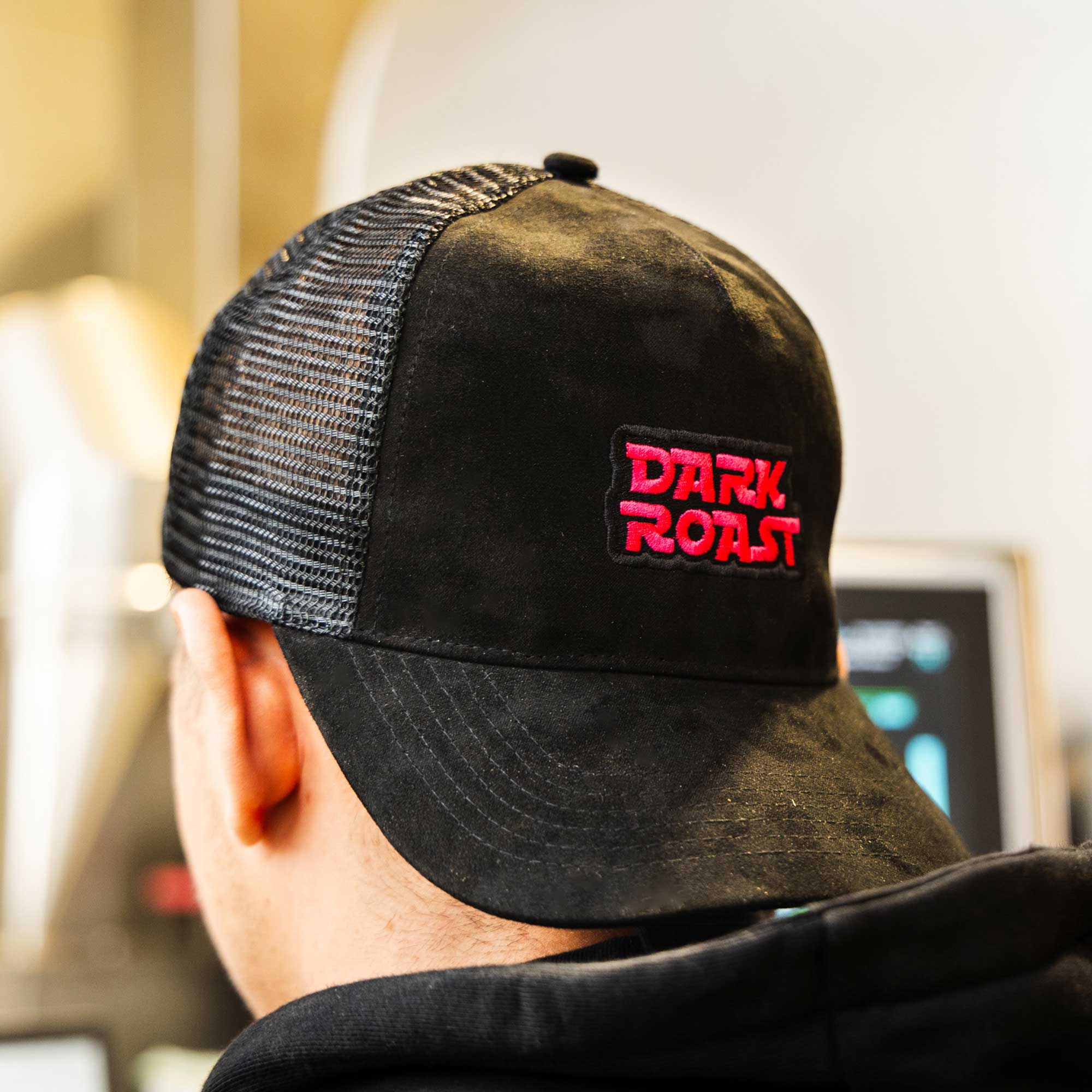 (Black) Suede trucker caps with a retro style snapback size adjuster. One size. (Black, embroidered with bright pink Dark Roast logo). Suede finish front panel.